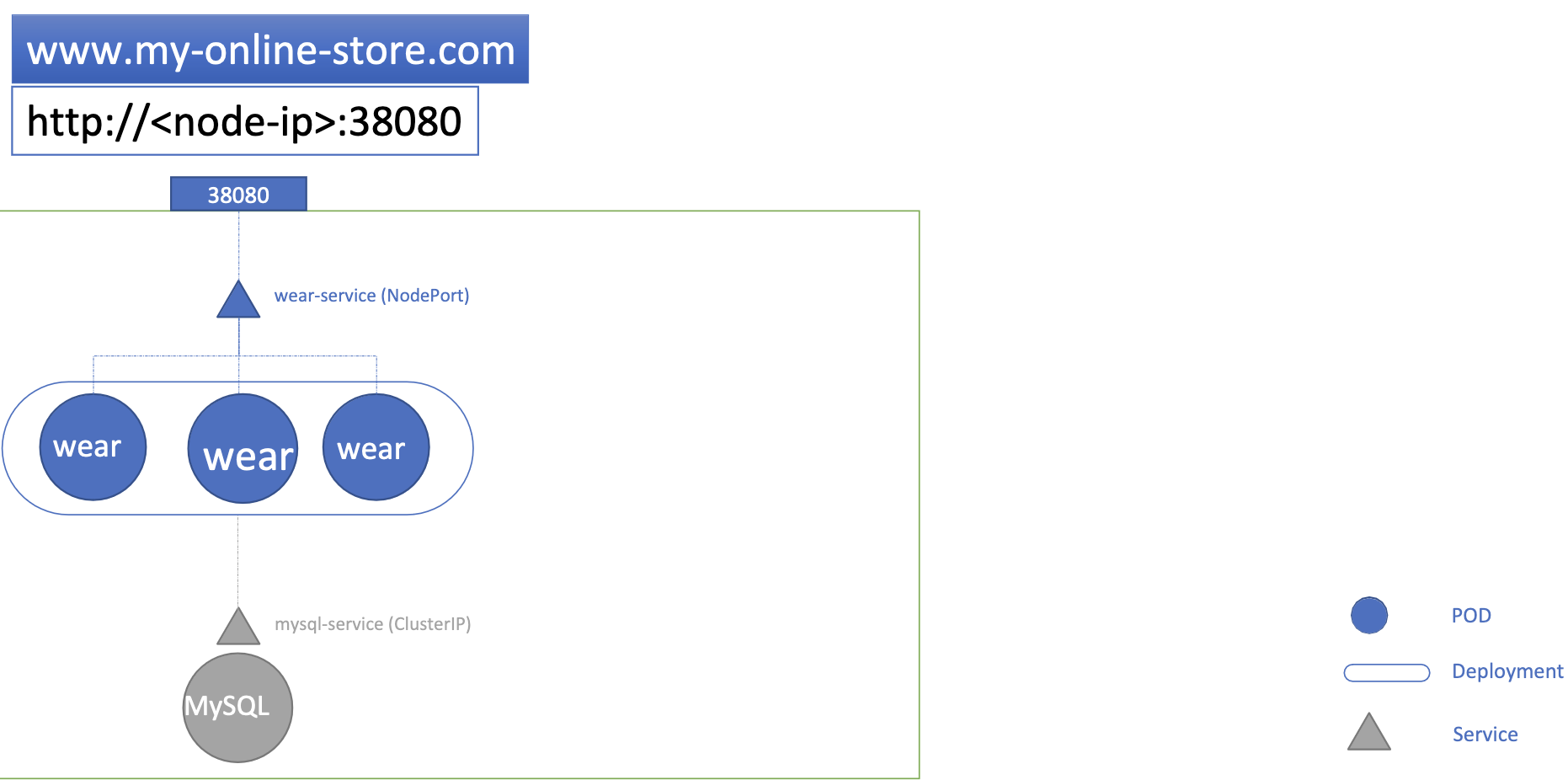다음은 MySQL Pod와 (3개의 Replica된 Pod으로 구성된) Deployment로 구성된 간단한 웹사이트의 구성이다.