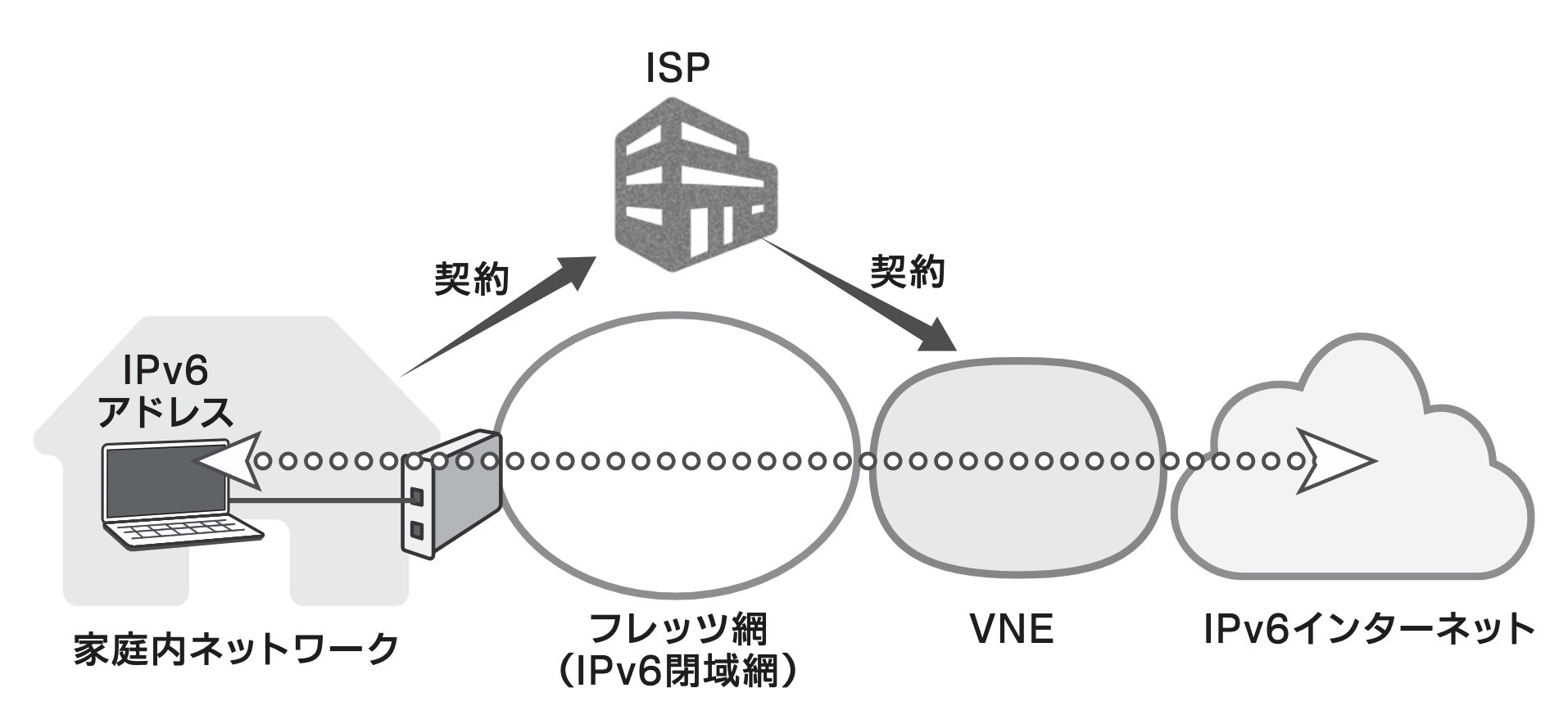 MVNO 사업자가 실제 망을 가지고 있지 않고 MNO의 설비와 MVNE의 시스템을 빌려 쓰는 것처럼, IPoE 환경에서 ISP는 NTT의 설비와 VNE의 게이트웨이를 빌려 쓰는 것뿐이며 실제 인터넷 연결 서비스를 제공하지 않습니다.