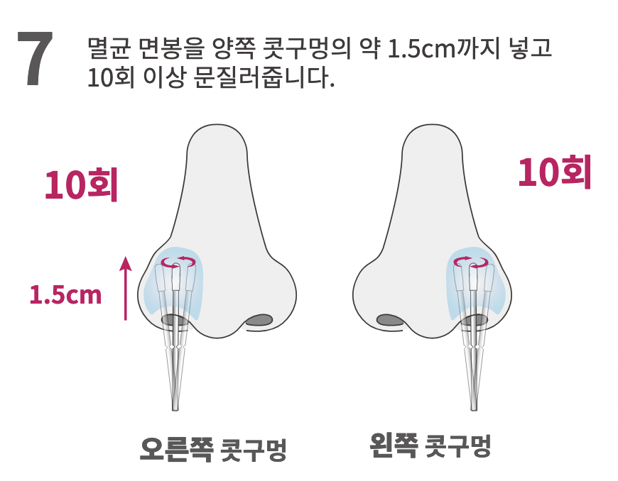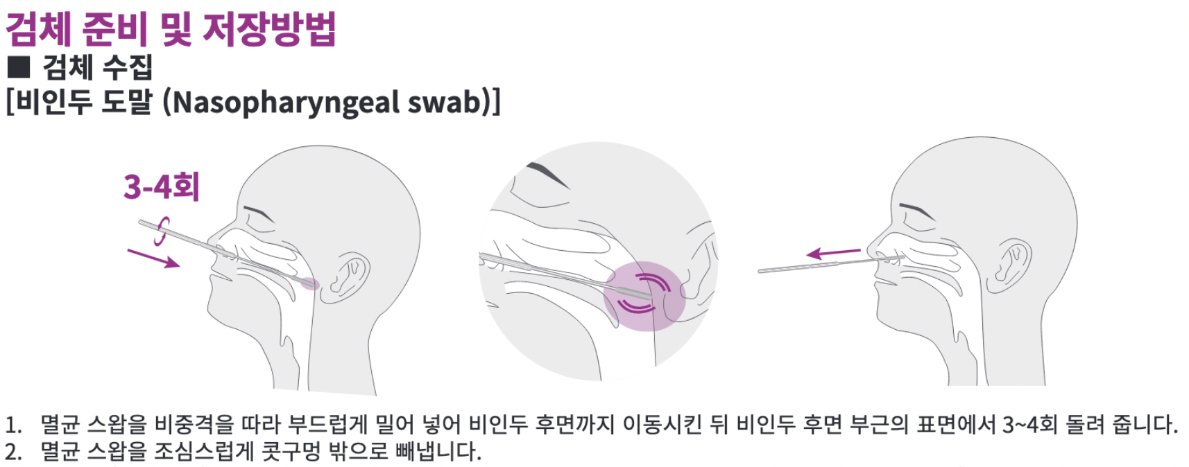 코로나 검사를 받아보신 적이 있으시다면, 검체를 채취할 때 재채기가 나올 정도로 콧속 깊숙히 (비인두鼻咽頭까지) 면봉을 집어넣는 경험을 해 보셨을 겁니다. 이처럼 의료시설에서 진행하는 검사의 경우 통상적으로 비인두도말 검체를 채취하지만, "홈 키트"라서 그런지 설명서상에서는 "코 안쪽으로 ... 면봉 솜 끝이 1.5센치에서 2센치 가량" 부분에서 검체를 채취하도록 되어 있습니다.