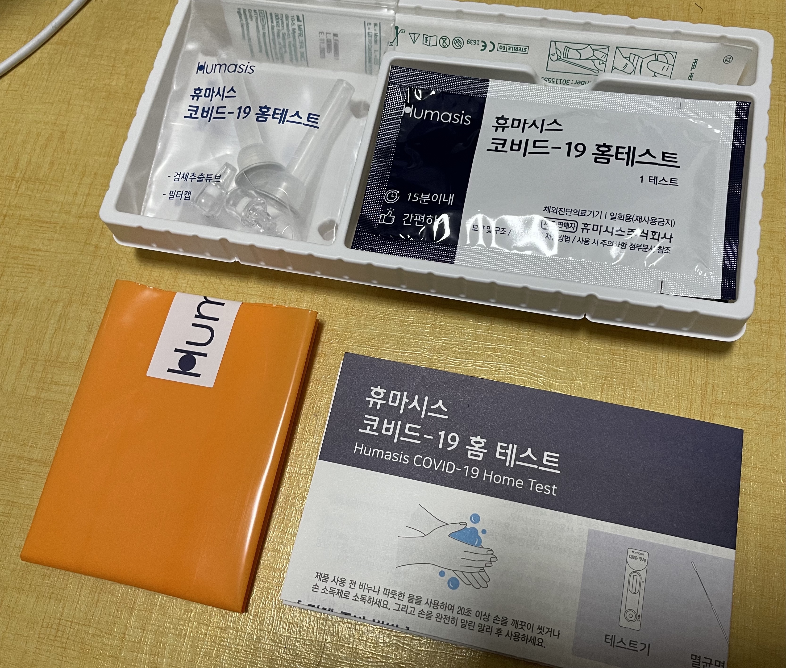 구성품은 전용 면봉, 검체추출튜브, 필터캡, (비닐포장되어 있는) 테스트기, 설명서와 주황색 비닐봉투입니다. (주황색 비닐봉투는 검사를 마치고 나서 사용된 도구들을 담아 버리는 데 씁니다.)