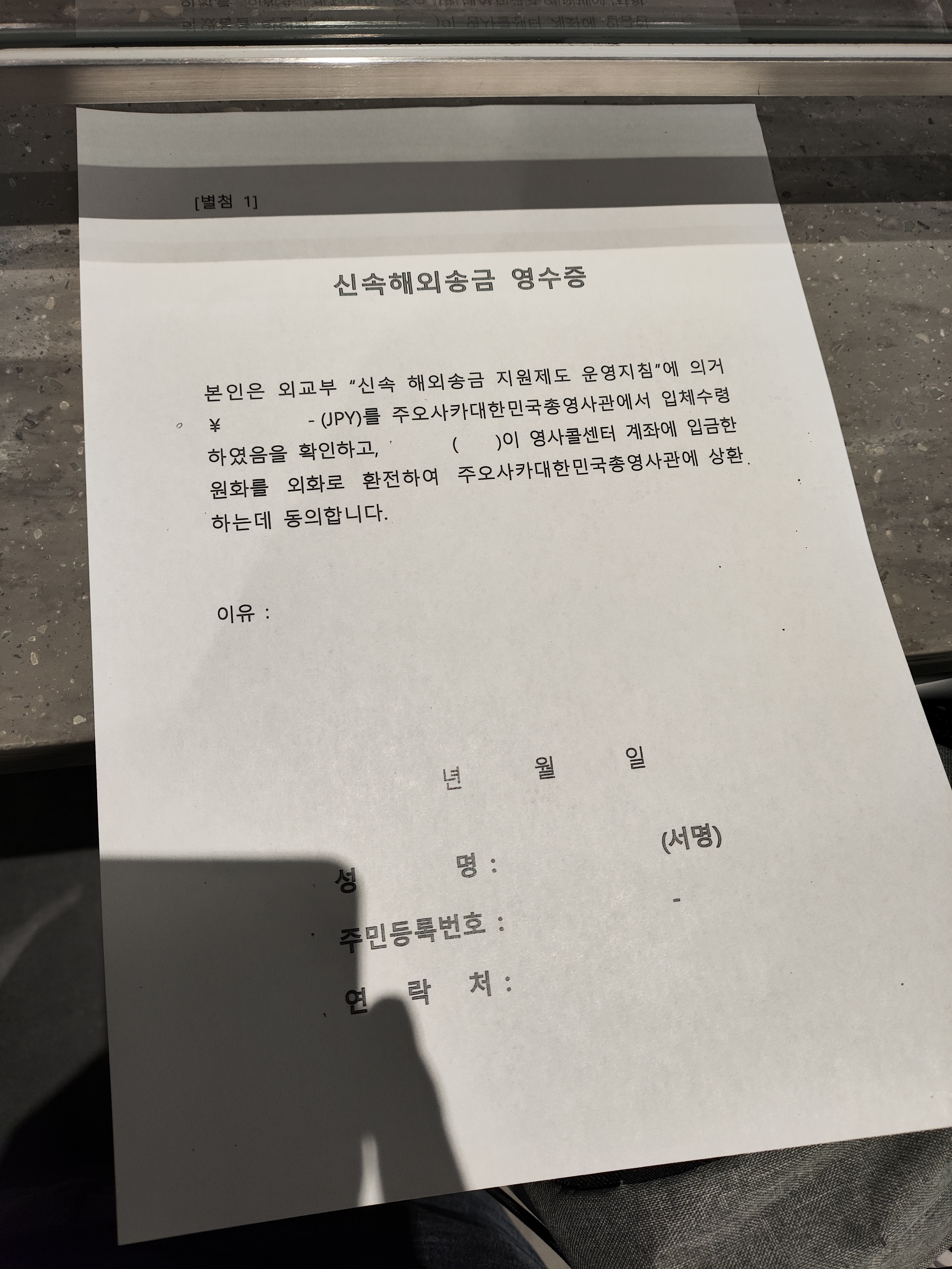 그러면 전산 통보를 받은 담당자분이 외화 현금을 주십니다. 저 같은 경우에는 담당자분이 SBJ은행 현금카드를 가져오셔서는, 영사관 앞에 있는 세븐일레븐 편의점 ATM에서 현금을 손수 인출해서 전달해 주셨습니다...