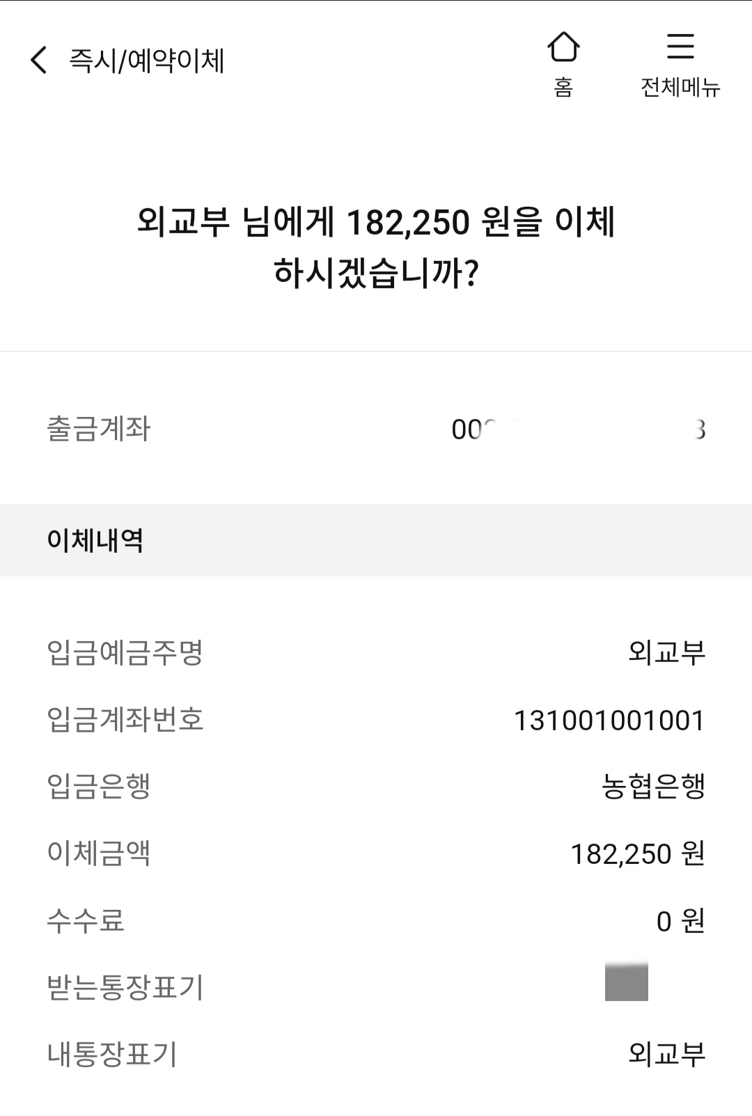 아무튼 외교부 계좌(농협은행 기준 계좌번호 1310-01-001001, 예금주: 외교부)로 정해진 금액을 송금하고, 다시 영사콜센터에 송금 완료하였다고 연락을 하면 됩니다.