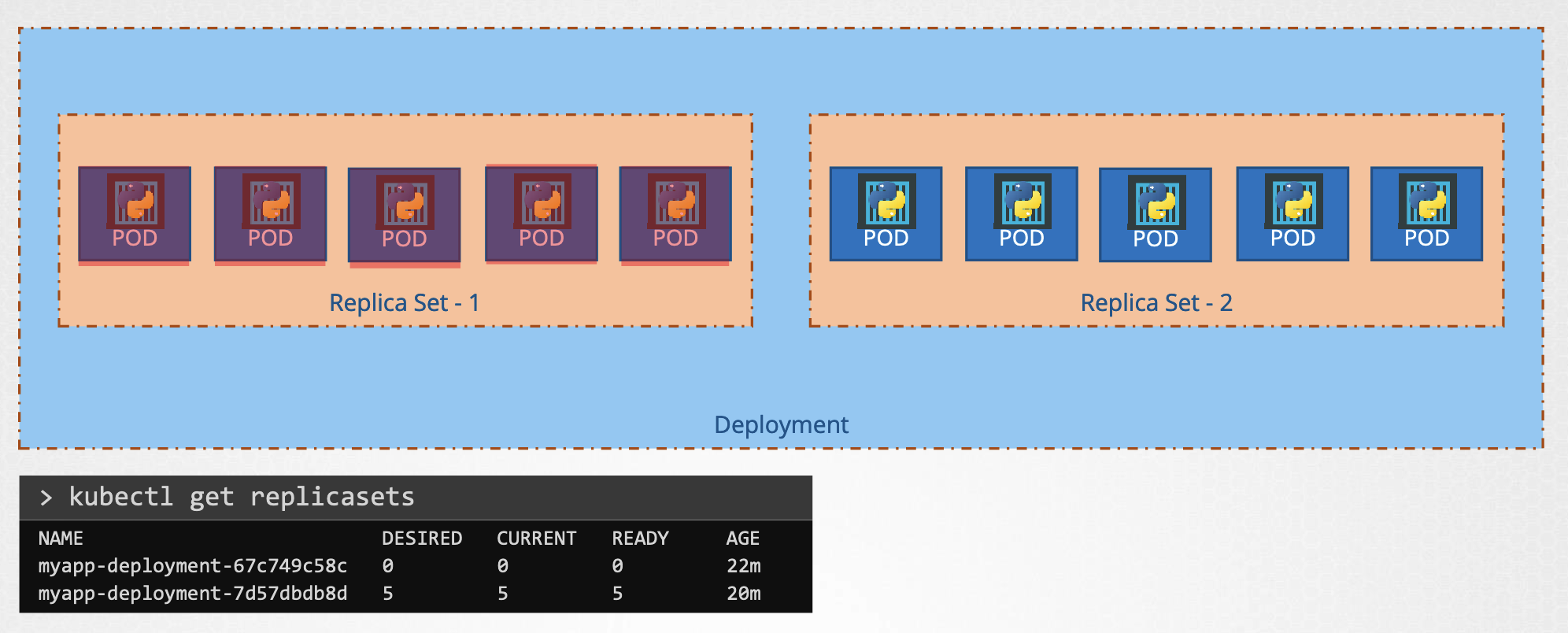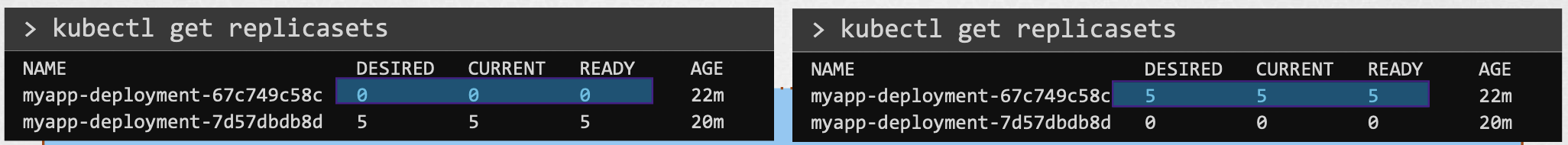 - RollingUpdate에서는 기존 Replica Set의 수를 하나씩 줄이면서, 새로운 Replica Set의 수를 하나씩 올리는 식으로 대응하고 있음을 볼 수 있다.
