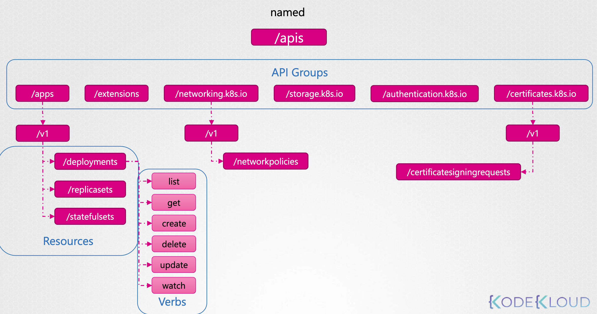 /apis/apps/v1/deployments,/apis/apps/v1/replicasets,/apis/apps/v1/statefulsets- 그 하위에 Verbs, (list, get ,create, delete, update, watch...) 들이 있다.